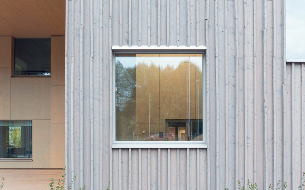 La façade est recouverte de panneaux verticaux en mélèze de différentes largeurs et traitée avec une lasure teintée. À l’intérieur, les surfaces en bois lamellé croisé sont en grande partie laissées apparentes. Le grand volume non chauffé sous toiture et sa structure sont constitués de murs et de panneaux en CLT qui ont permis une construction ouverte avec un accès aisé pour les travaux d’entretien ainsi qu’un espace généreux pour les gaines de ventilation. Dans la phase de conception, les architectes ont accordé une importance particulière à la flexibilité et à la possibilité de relier les espaces: des passages de 3 m de large peuvent être découpés ultérieurement dans les cloisons porteuses en CLT sans nécessiter de renforcement structurel séparé.