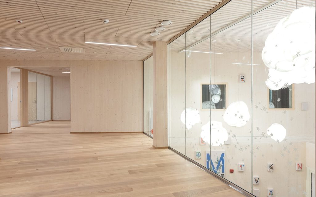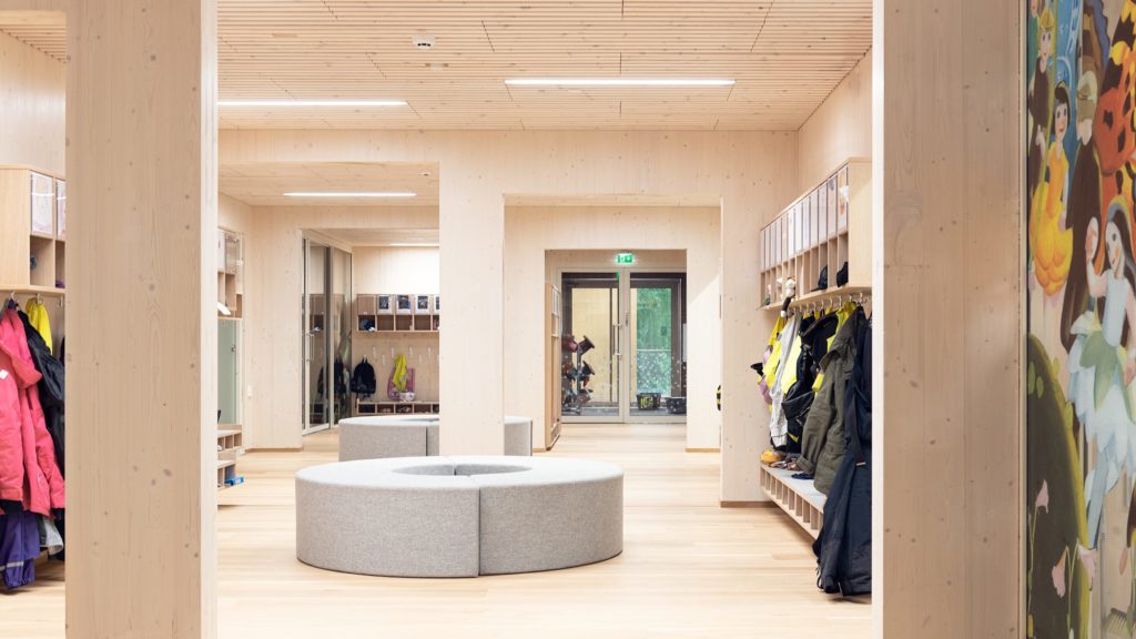 Spécialisé dans les jardins d’enfants et les écoles, AFKS (Arkkitehdit Fondelius+Keppo+Salmenperä Oy) a été fondé il y a près de 30 ans et emploie une quinzaine de personnes. La crèche à Tuusula illustre les possibilités d’utilisation du bois lamellé croisé (CLT) qui ont été développées spécifiquement en Finlande ces dernières années, comme l’utilisation de panneaux CLT pour les poteaux ou les murs CLT avec des ouvertures de plusieurs mètres de large. La réalisation en bois lamellé croisé attire ainsi tous les regards et le jury a apprécié: ‘Cette architecture légère et déstructurée est surtout spectaculaire par ce qu’elle sait éviter et permet d’utiliser abondamment le bois dans l’aménagement intérieur sans fatiguer l’œil’.